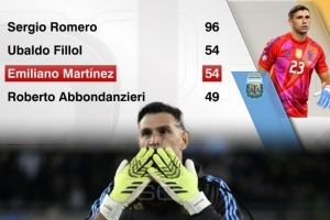 据ESPN统计,大马丁已为阿根廷出战54场比赛,追平菲洛尔并列队史门将出场第二多,而罗梅罗出场96次队史门将最多。