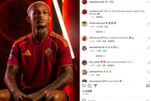 韦斯利晒出自己身披罗马球衣的定妆照,并配文:“很荣幸能够穿上这件球衣,罗马加油!”