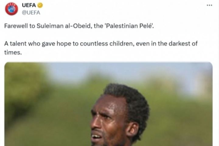 欧足联官方写道:“让我们告别苏莱曼-奥贝德,他被称作‘巴勒斯坦贝利’。即使是在最黑暗的时刻,他也给无数的孩子们带来了希望。”